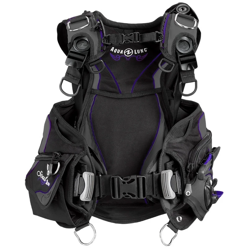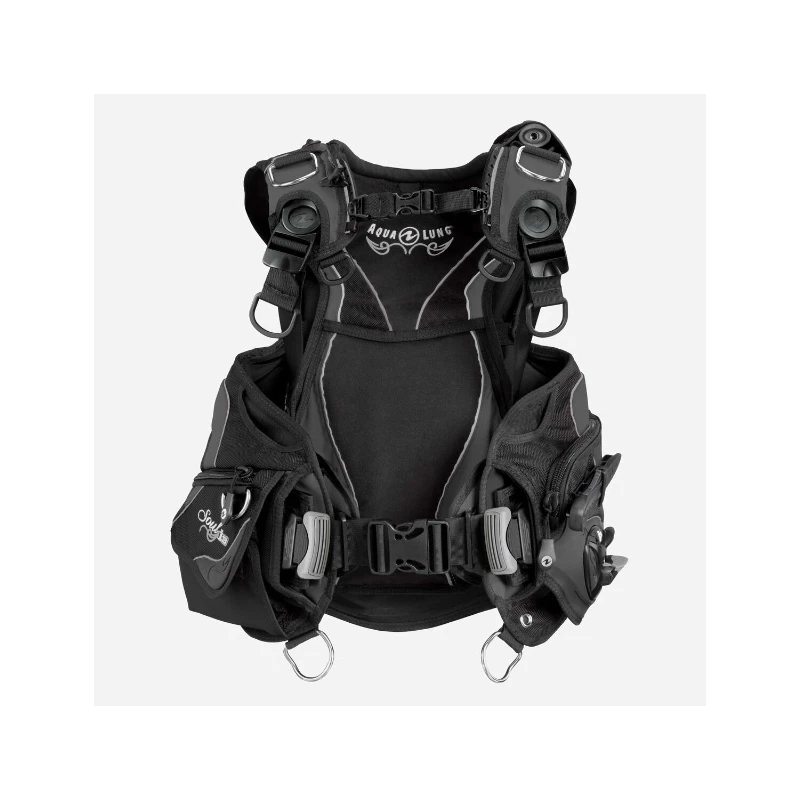 • Une poche à instruments (ou poche à Octopus) est également disponible en haut à gauche du gilet et offre davantage de polyvalence. Deux grandes poches à accessoires faciles d’accès et pourvues de fermetures à glissière sont situées de chaque côté du Soul. • Facilement accessibles, des points d’attache situés sur le côté gauche du gilet permettront la fixation de la plupart des couteaux Aqua Lung